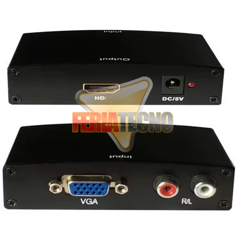 El convertidor VGA a HD convierte video y audio VGA en señal HDMI. Permite a los usuarios de PC mostrar su imagen no solo en el monitor de la PC, sino también en la TV, para mostrarla en una pantalla grande. Conversión y transmisión de señales digitales de dispositivos VGA a dispositivos HDMI. Conexiones: HDMI, conectores RCA de audio VGA Hasta 1080p